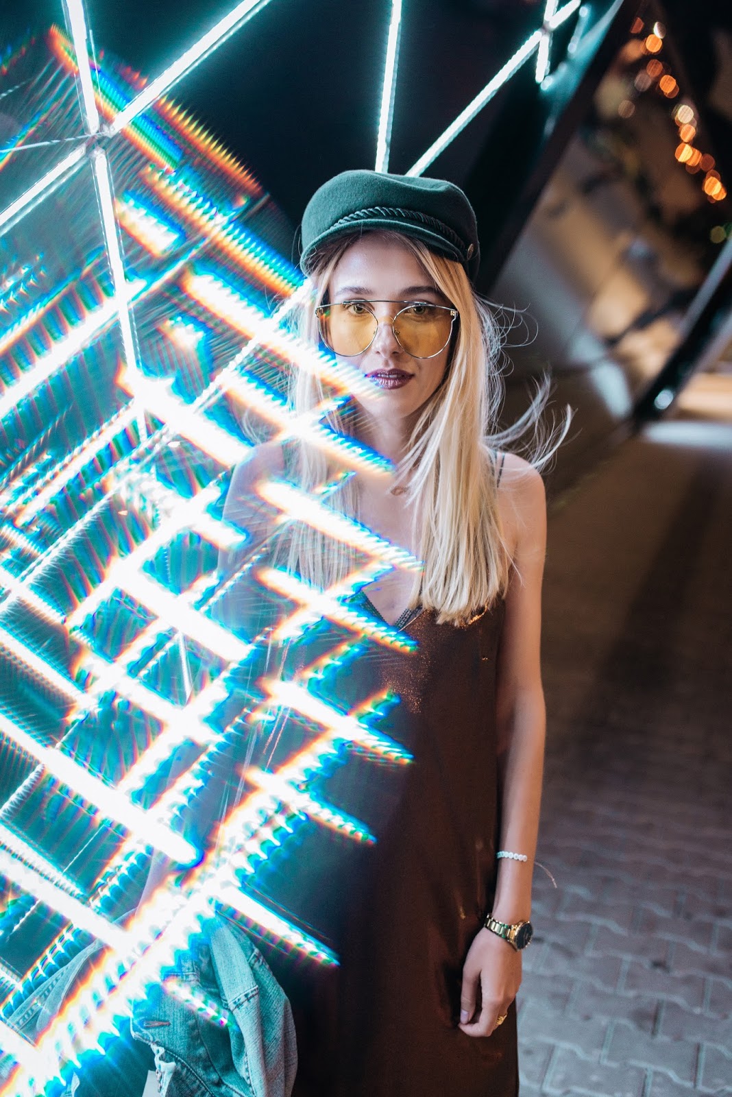 Аж не верится, что у нас с Артемом получились настолько крутые ночные фоточки! Для этой съемки я подобрала платье-металлик бронзового цвета. А когда Саша (визажист) увидела меня в нем, она сразу решила сделать мне макияж с акцентом на губы и бронзовыми тенями в тон к платью. И я вся такая сияющая отправилась на съемку, еще не подозревая, что мне предстоит оказаться в тележке из супермаркета и обматываться гирляндой на глазах у прохожих. Хорошо, что моя боязнь съемок на публике давно прошла, осталось распрощаться только с боязнью говорить на сцене. Shine bright!